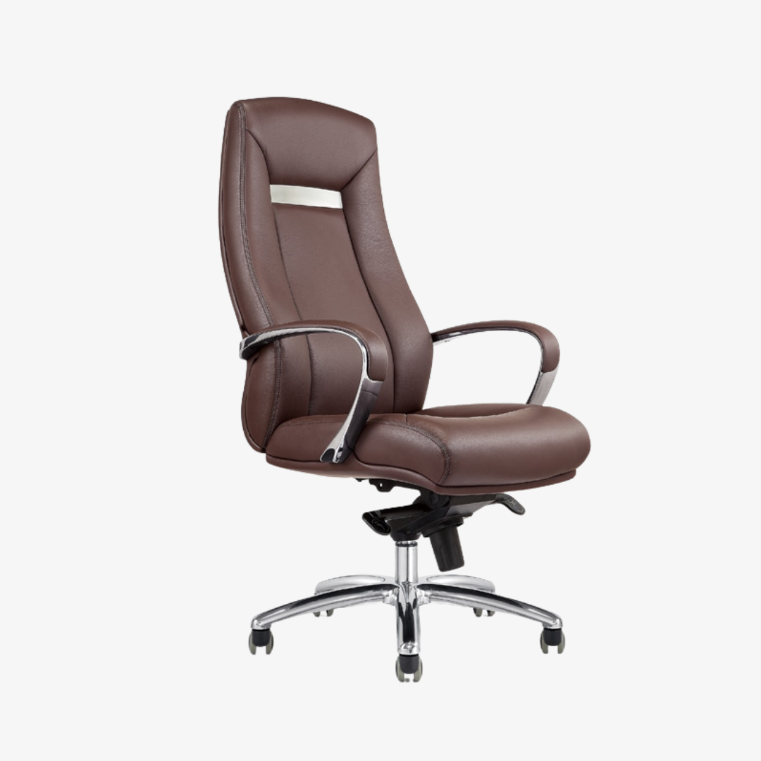 Fauteuil de direction cuir marron avec dossier haut et lignes arrondies