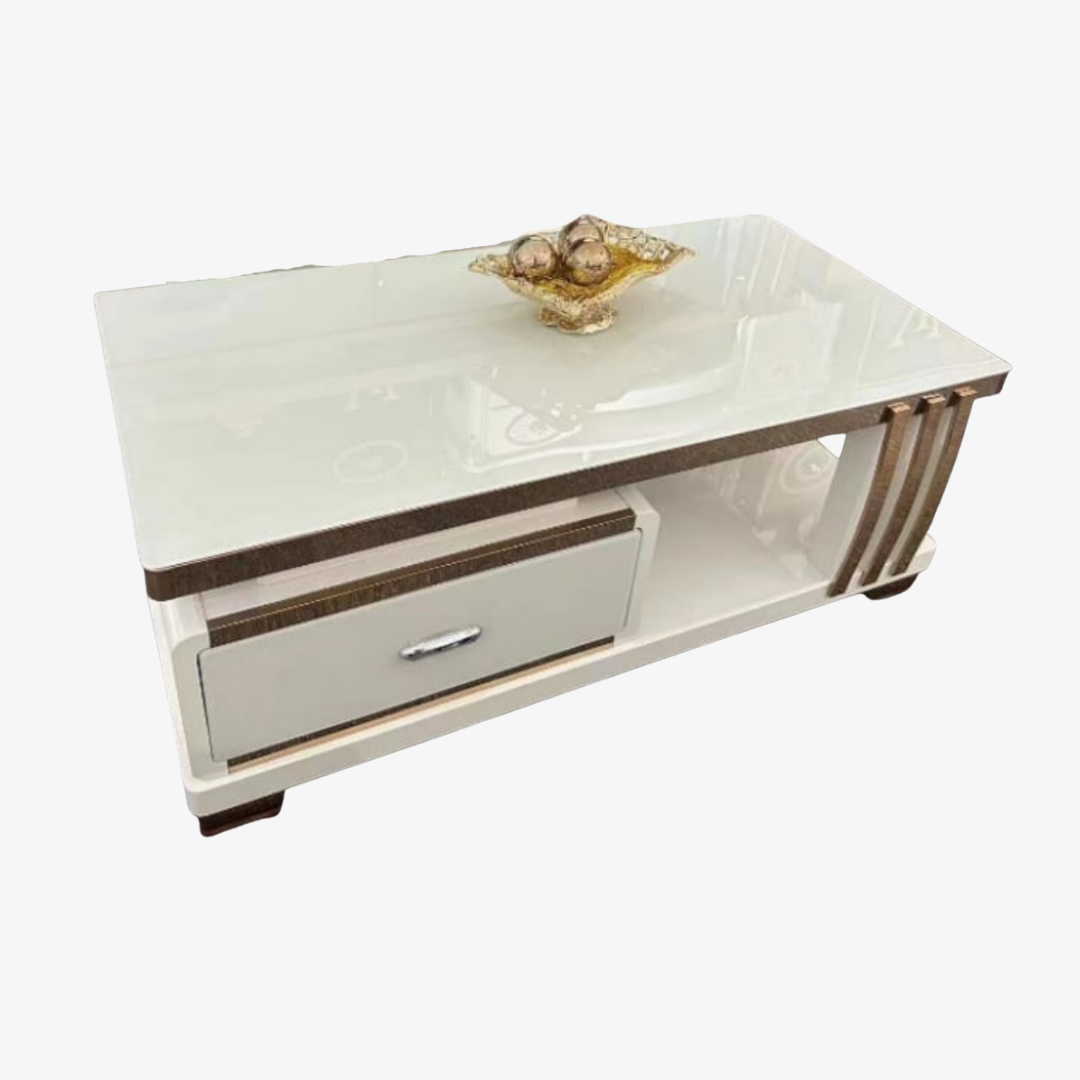 Table basse moderne blanche avec plateau effet marbre